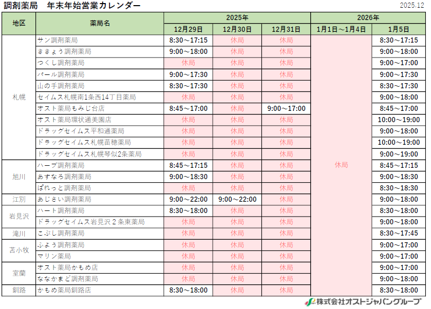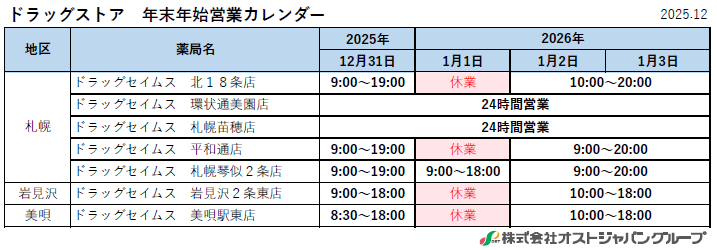 当社が運営するドラッグストア・調剤薬局の’25-’26年末年始の営業時間は次のとおりです。